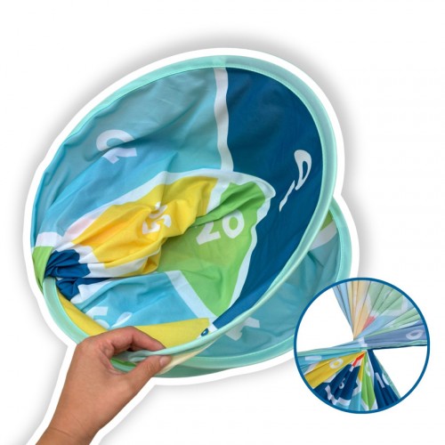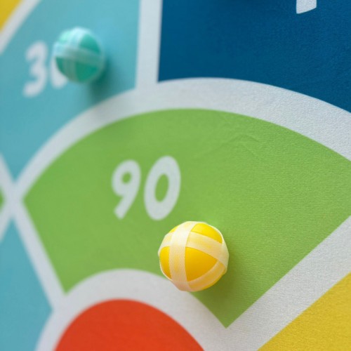 Vďaka našitému pútku možno terč ľahko zavesiť. Loptičky na suchý zips sa ľahko hádžu a bezpečne priľnú k terču.